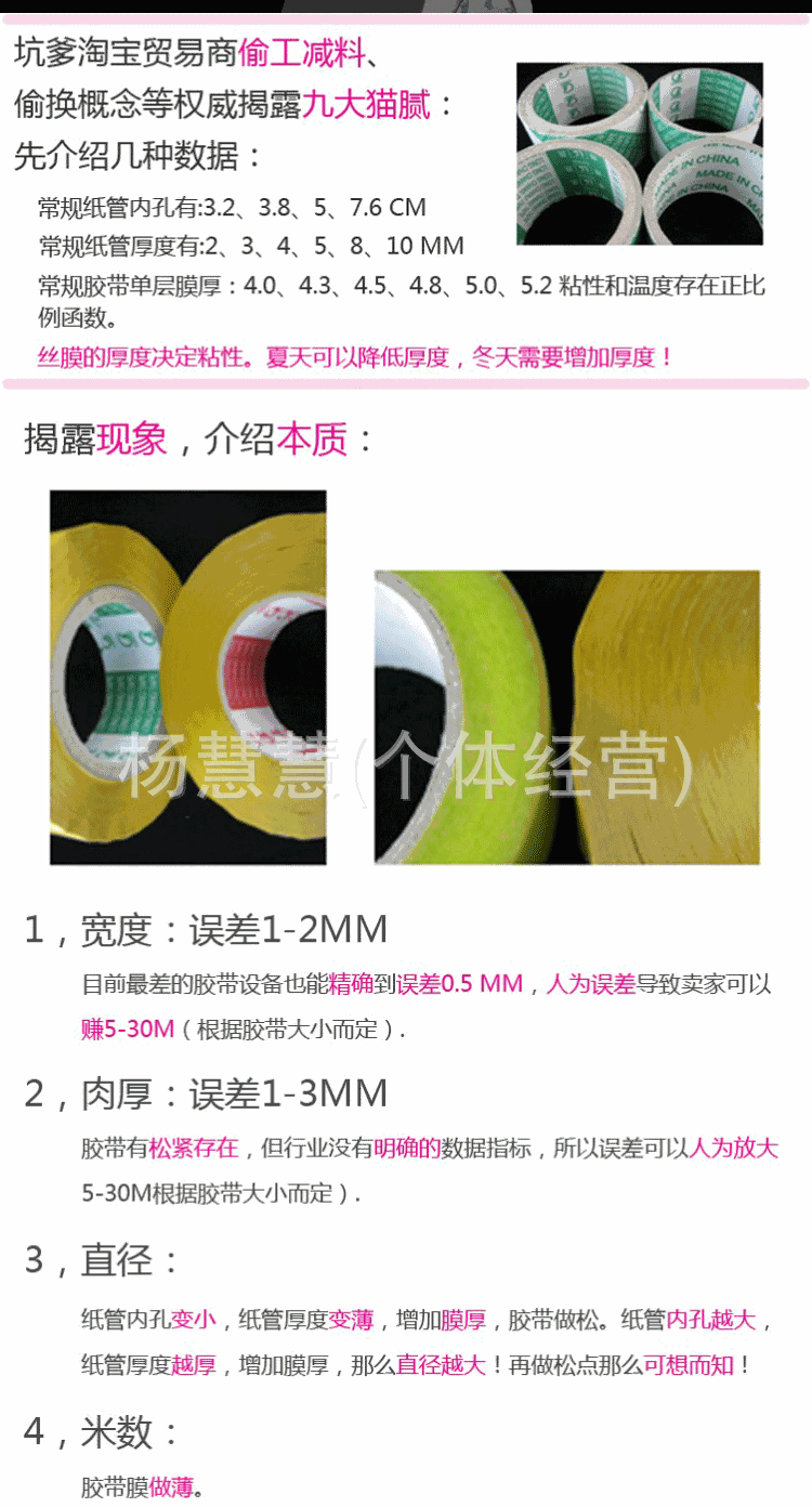 關(guān)于厚度問(wèn)題解釋?zhuān)哼@個(gè)問(wèn)題我相信是親們關(guān)心的問(wèn)題,因?yàn)楹芏嗳丝偸蔷湓?huà)問(wèn)客服就是“你們的膠帶有多厚”,或是“你們膠帶的肉厚有多少”。但是親們并不知道其實(shí)在我們業(yè)內(nèi),厚度根本就不是衡量膠帶的一個(gè)標(biāo)準(zhǔn),每一家的膠帶做工不一樣,松緊度不一樣,膜的厚度也不一樣!這就造成了有些商家偷換概念,他們不會(huì)明碼標(biāo)價(jià)說(shuō)這卷膠帶可用長(zhǎng)度多少,他們會(huì)說(shuō)這個(gè)肉厚2.5cm或是3cm,但事實(shí)上200米的長(zhǎng)度可以做到2.5cm的厚度,180m甚至150m的長(zhǎng)度也可以做到同樣的厚度!