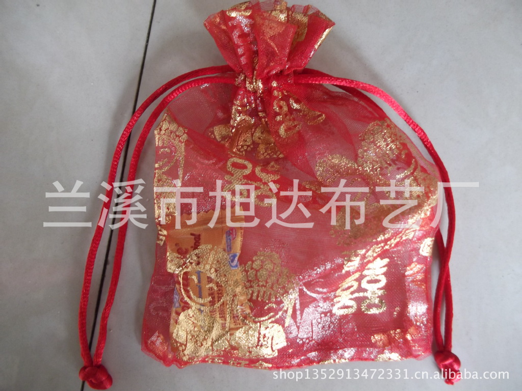 【描述】寶貝面料為雪紗面料,用上有燙金百年好合和雙喜字樣、古裝新郎新娘圖案的大紅紗布縫制而成,上口留有雙平線,用在手工做金繩子用的。三方縫制而成。長方形口向上,在長方形紗袋封口處有兩根金色細(xì)繩,在裝好禮品后,將兩根細(xì)繩朝不同方向輕輕一束即可。