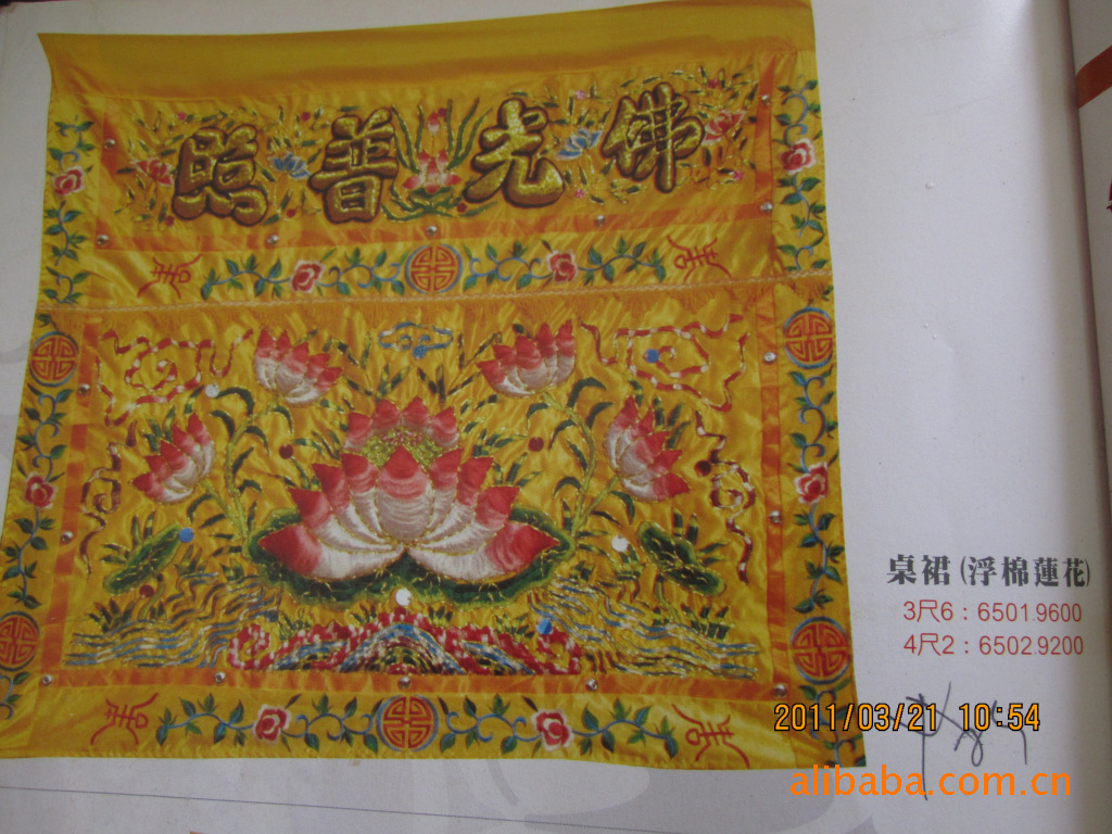桌圍,原用于遮住桌子,可以在桌后放一些物品,也叫遮羞布。桌圍上用鮮艷的顏色繡著吉祥富貴的圖案,寓意人們渴望幸福安康的愿望。桌圍也廣泛地用佛教佛堂中,大多以蓮花為主題.