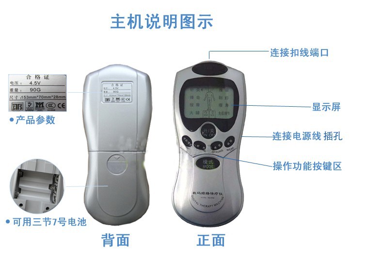 ● 電極位置:用濕毛巾將要治療的部位擦干,去掉油漬和汗?jié)n,再將電極片直接粘貼在治療部位,兩個(gè)電極片需同時(shí)放置于體表,否則無(wú)法進(jìn)行治療,電極片無(wú)須對(duì)稱(chēng)放置。