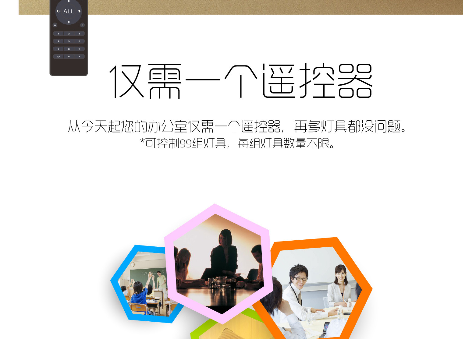 單獨/集中控制: 完美實現(xiàn)單控/組控/集控等多種控制功能,可單獨控制某一盞燈具,集中控全部燈具,1個遙控器同時控制無數(shù)盞燈。操作簡易:同時兼容多種控制方式,墻體普通開關(guān)調(diào)節(jié)、無線遙控調(diào)節(jié)、觸摸面板二次節(jié)能控制。距離可達20米以上。
