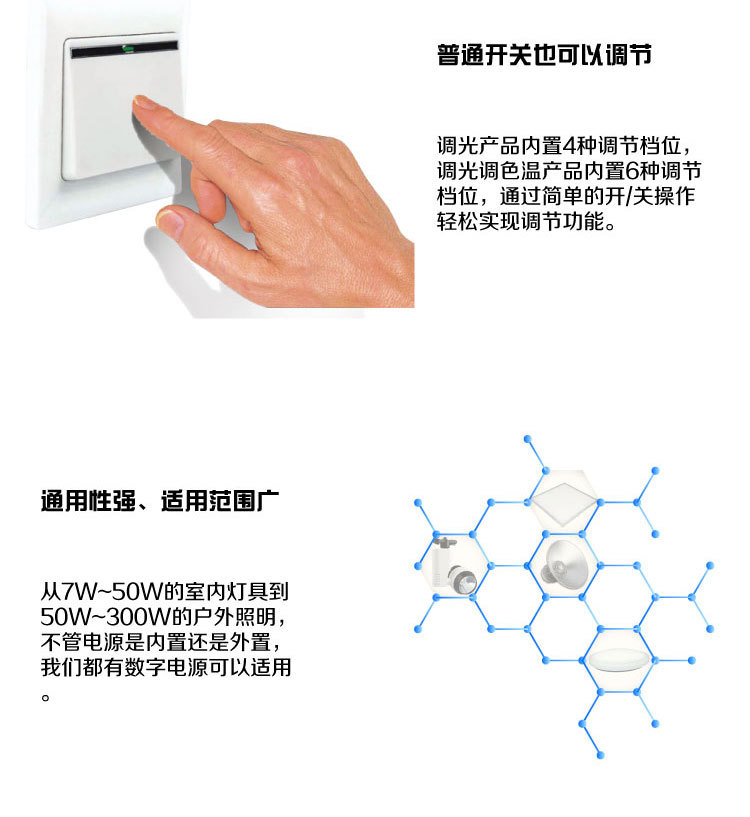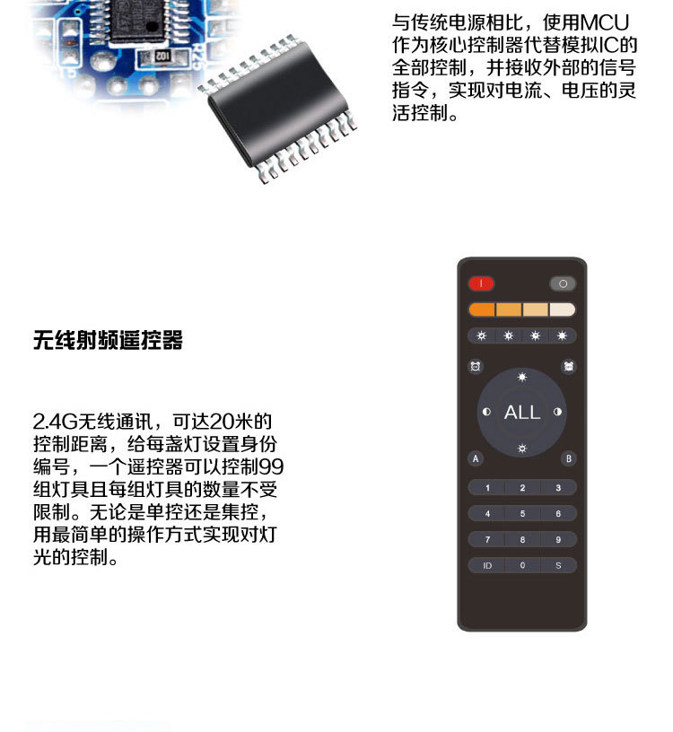 單獨(dú)/集中控制: 完美實(shí)現(xiàn)單控/組控/集控等多種控制功能,可單獨(dú)控制某一盞燈具,集中控全部燈具,1個(gè)遙控器同時(shí)控制無(wú)數(shù)盞燈。操作簡(jiǎn)易:同時(shí)兼容多種控制方式,墻體普通開(kāi)關(guān)調(diào)節(jié)、無(wú)線遙控調(diào)節(jié)、觸摸面板二次節(jié)能控制。距離可達(dá)20米以上。