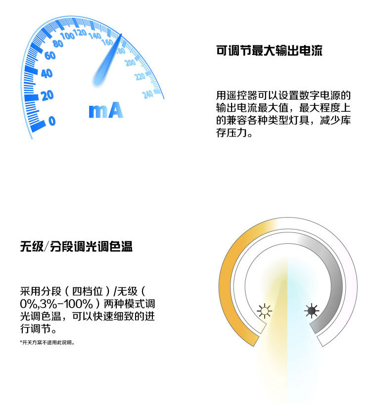 二次節(jié)能、自動(dòng)調(diào)光:1、實(shí)現(xiàn)分段/無(wú)級(jí)調(diào)光調(diào)色溫,自由選擇3%-100%調(diào)節(jié)亮度,更節(jié)能,自由設(shè)置區(qū)域照明效果。
