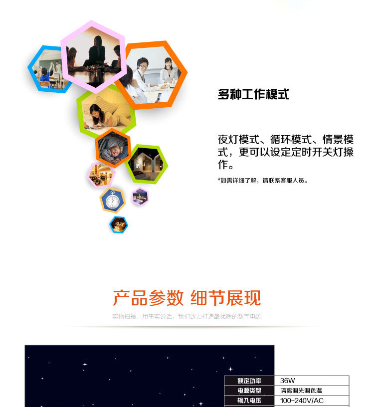 多種情景,高檔舒適:實(shí)現(xiàn)分段/無(wú)級(jí)調(diào)光。小夜燈模式,循環(huán)演示模式,定時(shí)開(kāi)關(guān)模式,各種情景照明模式,讓整個(gè)燈光環(huán)境變得更加生動(dòng),打造個(gè)性化的燈光模式。