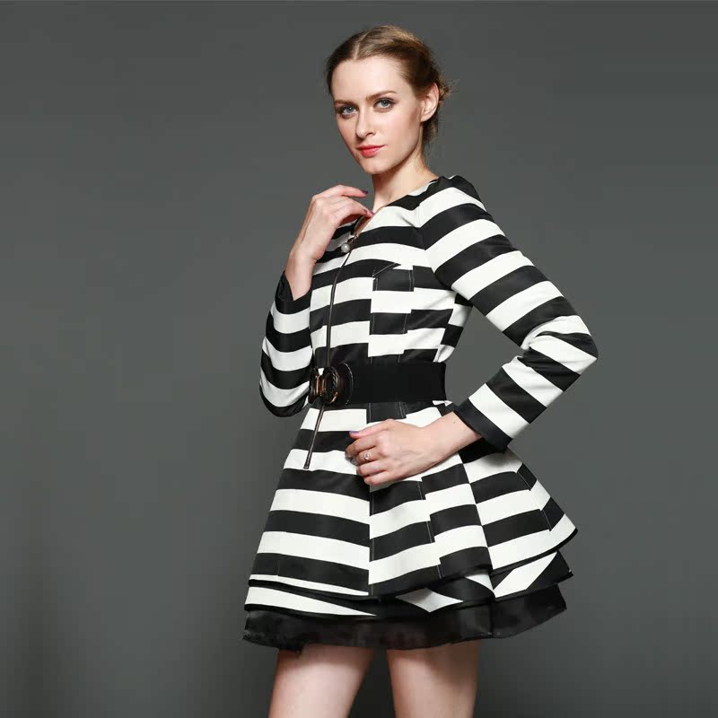 2015春季新款女款 歐美時尚大牌氣質(zhì) 黑白斑馬條紋高腰長袖連衣裙