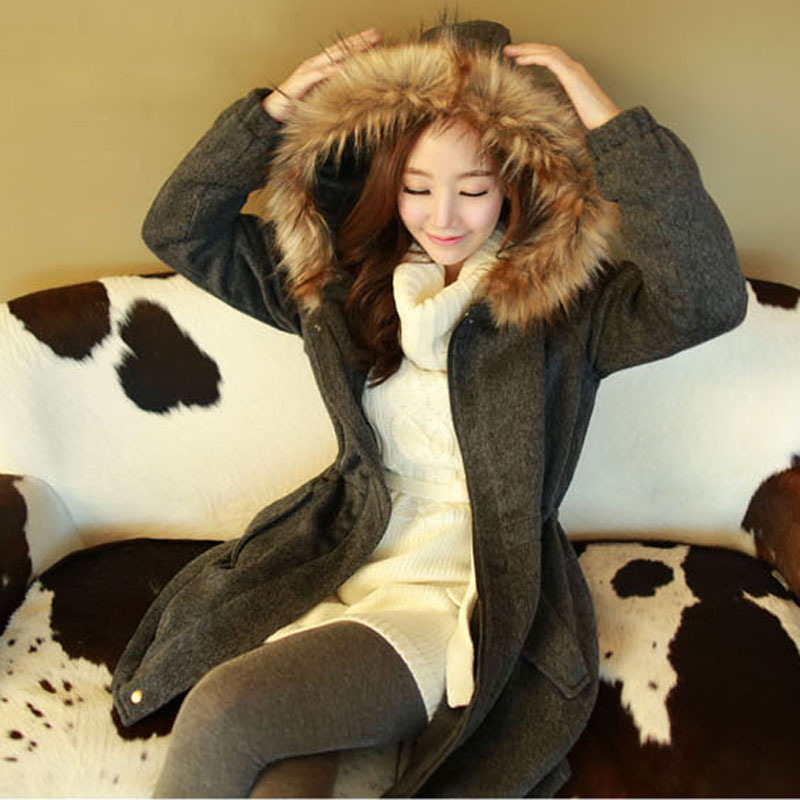 東大門代購2014冬季韓國同步款豪華大毛領(lǐng)夾棉保暖中長款寬松呢子大衣毛呢外套