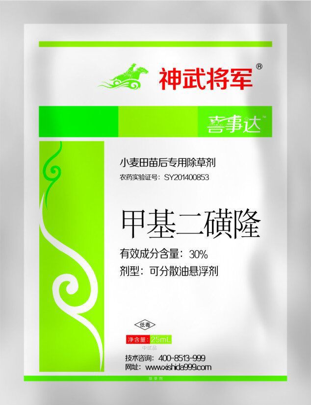 產(chǎn)品說(shuō)明:神武將軍為小麥田苗后防除禾本科雜草和部分闊葉雜草除草劑,施藥期寬,可防除節(jié)節(jié)麥、硬草、早熟禾、堿茅、棒頭草、看麥娘、毒麥、多花黑麥草、野燕麥、蠟燭草、牛繁縷、薺菜等麥田多數(shù)一年生禾本科雜草和部分闊葉草,對(duì)(雀麥)、偃麥草等極惡性禾本科雜草也有較好的防效。
