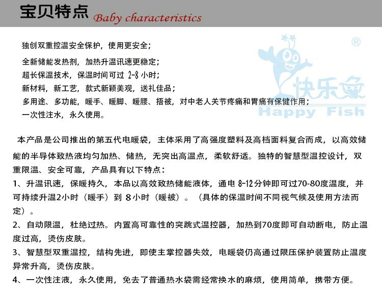 7.一次性注水,性使用:本品添加適量的熱能轉(zhuǎn)換促進(jìn)劑,使之與水混合,即能使用,免去了傳統(tǒng)熱水袋頻繁換水的麻煩和不安全。