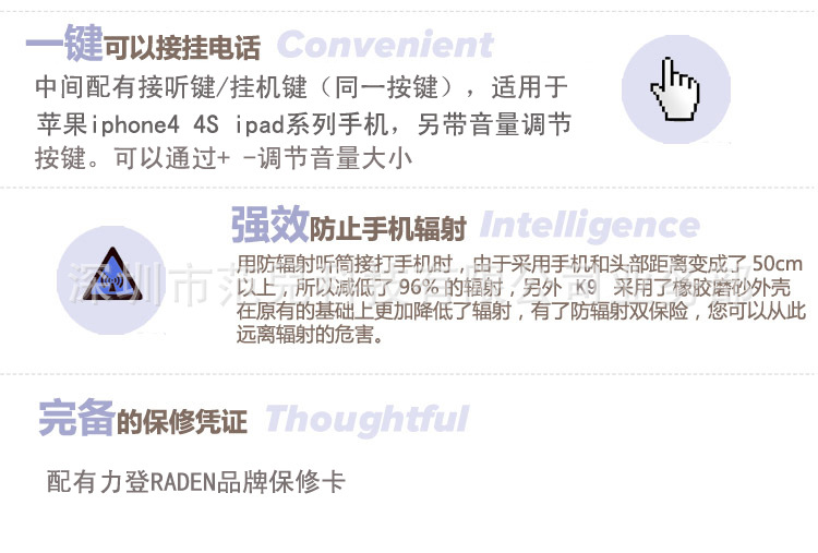 本產(chǎn)品是一款時尚拉風(fēng)的iphone手機專用話筒,它除了可以接聽電話,隨意DIY,涂鴉自己喜歡的圖案,還可以聽廣播、音樂、MP3。重要的是他可以排除用手機直接接聽的噪音干擾,聲音清楚響亮,也同樣的避免輻射。走在路上感覺自己很受人注意,拉風(fēng)與眾不同。