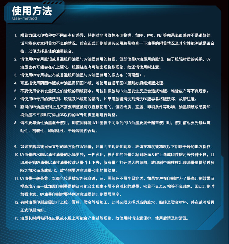 8、請(qǐng)不要與油性油墨混合使用,即使同樣是UV油墨但不同系列的UV油墨要混合起來使用時(shí),使用前也要先確認(rèn)流動(dòng)性、密著性、印刷適性、干燥等是否合適。