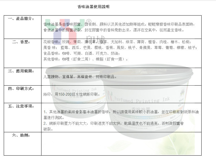 產(chǎn)品說明Specification香味油墨是由香味膠囊、黏合劑、顏料以及其他添加劑等組成。輕輕摩擦香味印刷品表面時(shí),會(huì)使油墨中的膠囊破裂,封在膠囊中的香料便飛散出來,暫時(shí)漂浮在空氣中,產(chǎn)生香味。
