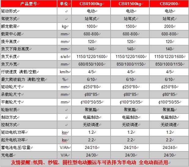 CBR紙筒電動(dòng)搬運(yùn)車(chē)技術(shù)參數(shù):