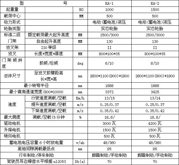 二、四輪車胎型座駕式蓄電瓶叉車主要參數(shù)表: