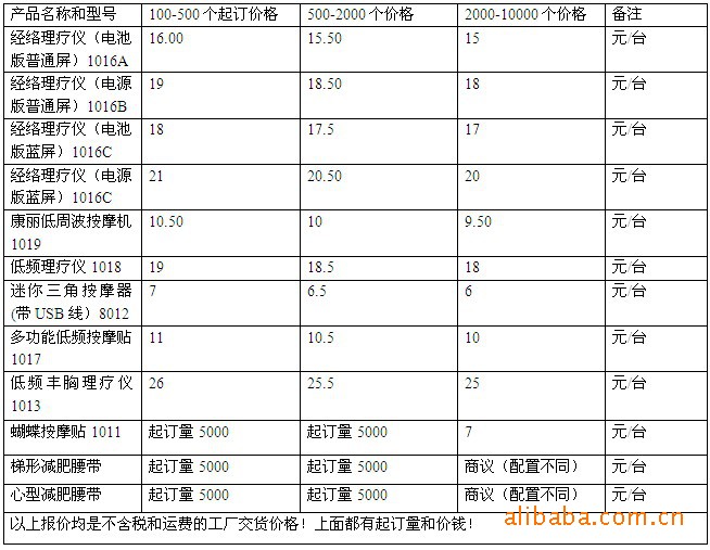 產(chǎn)品功能: 微電腦減肥瘦身腰帶擁有6種不同震蕩模式,10檔強(qiáng)度,讓脂肪相互撞擊,從而分解多余的脂肪,適合不同的人群需求 擁有碎脂機(jī),從此減肥不用上健身房,不用節(jié)食. 能讓你在上班,購(gòu)物,看電視,做家務(wù)...任何時(shí)間,任何地點(diǎn)都能使用. 不僅小腹,連大腿,手臂,臀部任何一處肥胖的部位都能使用.想瘦哪里就瘦哪里!整套產(chǎn)品包含: ①一個(gè)控制器 ;②一條束帶 ;③兩條可伸縮的綁帶 ;④兩粒電池;⑤100mL按[mo]油1瓶 。使用一粒CR2032鋰電池,產(chǎn)品操作非常簡(jiǎn)便,只有三個(gè)控制鍵進(jìn)行操作,而且程序會(huì)自動(dòng)運(yùn)行,當(dāng)您選擇好鍛煉部位,打開電源,調(diào)節(jié)好強(qiáng)度后程序自動(dòng)運(yùn)行12分鐘,12分鐘后自動(dòng)停止,如果您想繼續(xù)進(jìn)行,請(qǐng)重新開啟。注意使用時(shí)必須貼著皮膚使用,而且使用時(shí)涂上按[mo]油效果更佳, 使用后一、兩分鐘內(nèi),可能會(huì)有不同程度的不適反應(yīng)(如癢、麻、多汗)等感受,均屬正常反應(yīng)。 1. 微電腦減肥瘦身腰帶有6種不同震蕩模式,讓脂肪相互撞擊,從而分解多余的脂肪; 2. 肌肉鍛煉單元工作時(shí)產(chǎn)生電脈沖; 3. 產(chǎn)品操作非常簡(jiǎn)便,只有三個(gè)控制鍵進(jìn)行操作而且程序會(huì)自動(dòng)運(yùn)行; 4. 注意使用時(shí)必須粘著皮膚,涂上瘦身精華素效果更佳,使用后一、二分鐘內(nèi),可能會(huì)有不同程度的不適反應(yīng)(如癢、麻、多汗)等感覺,均屬正常反應(yīng)。 技術(shù)參數(shù): 外箱尺寸: 58.5*46.5*53cm 裝箱數(shù)量:80PCS