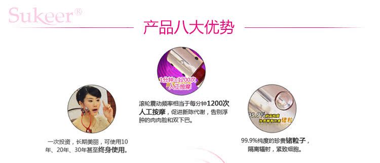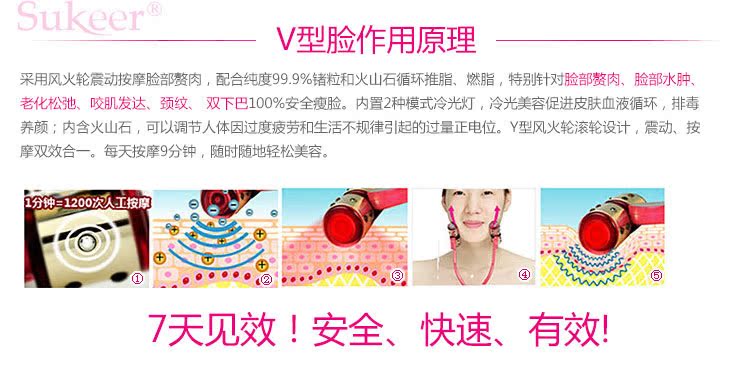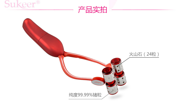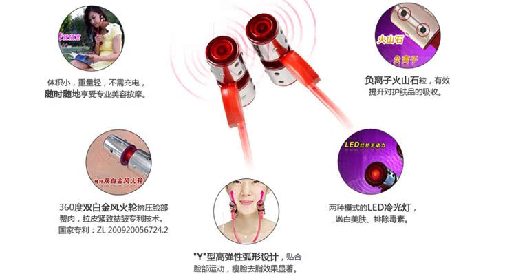 塑可兒瘦臉風(fēng)火輪是從日本引進(jìn)技術(shù),在中國取得專利,專利號ZL6724.2。采用風(fēng)火輪震動(dòng)按[mo]臉部贅肉,配合純度99.9%鍺粒子和火山石循環(huán)推脂、燃脂,特別針對大圓臉、大肉臉、嬰兒肥,能有效瘦臉。內(nèi)置2種模式冷光燈,冷光美容促進(jìn)皮膚血液循環(huán),排毒養(yǎng)顏;內(nèi)含火山石粒,可以調(diào)節(jié)人體因過度疲勞和生活不規(guī)律引起的過量正電位。Y型風(fēng)火輪滾輪設(shè)計(jì),震動(dòng)、按[mo]雙效合一。每天按[mo]9分鐘,隨時(shí)隨地輕松美容。在日本、韓國銷售非?;鸨?,顧客滿意度達(dá)到95%以上。