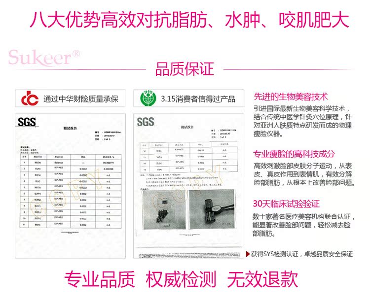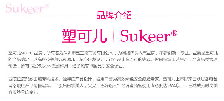 Sukeer塑可兒品牌,為深圳市嘉寶燊商貿(mào)有限公司創(chuàng)立。塑可兒瘦臉風(fēng)火輪套裝是網(wǎng)絡(luò)熱銷的人氣品牌產(chǎn)品,專為期望瘦臉的人士設(shè)計(jì)。具有瘦臉、去除眼角皺紋以及鍛煉表情肌、減緩皮膚老化的美容功效,深受眾多女性青睞和關(guān)注。Sukeer塑可兒產(chǎn)品皆由精細(xì)工藝、嚴(yán)謹(jǐn)管理所生產(chǎn),產(chǎn)品成分安全,并且對人體無任何副作用,給予顧客卓越品質(zhì)安全保證。