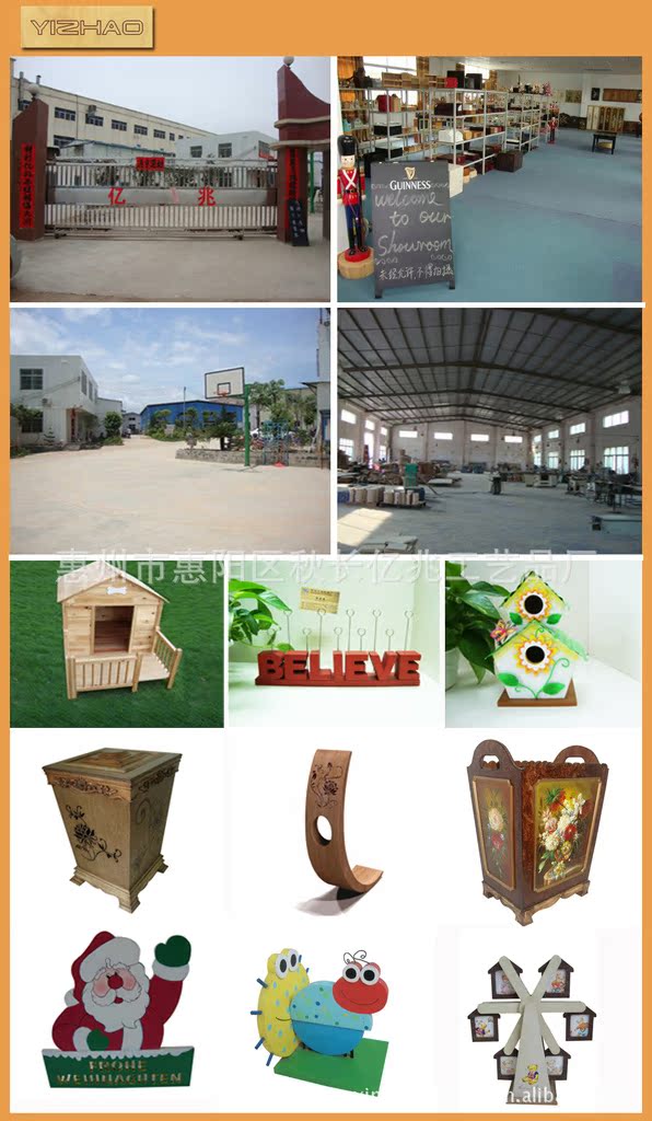公司簡介:惠州市惠陽秋長億兆工藝品廠是一家經(jīng)國家相關(guān)部門批準注冊的企業(yè)。惠州市惠陽秋長億兆工藝品廠憑著良好的信用、優(yōu)良的服務(wù)與多家企業(yè)建立了長期的合作關(guān)系?;葜菔谢蓐柷镩L億兆工藝品廠熱誠歡迎各界朋友前來參觀、考察、洽談業(yè)務(wù)。主營木制裝飾品;木制禮品;木制工藝品;木制玩具;副業(yè)經(jīng)營;五金節(jié)日禮品。 本廠擁有較先進的加工設(shè)備,可根據(jù)客戶要求生產(chǎn)不同規(guī)格尺寸、不同材料、不同顏色的各種中高檔木制工藝品。產(chǎn)品款式高檔精美、工藝精良,具有較高的藝術(shù)品位和使用價值,成為廣大用戶信賴的精品。本公司以"質(zhì)量求生存、信譽求發(fā)展'為經(jīng)營理念,以"客戶至上'的服務(wù)宗旨!