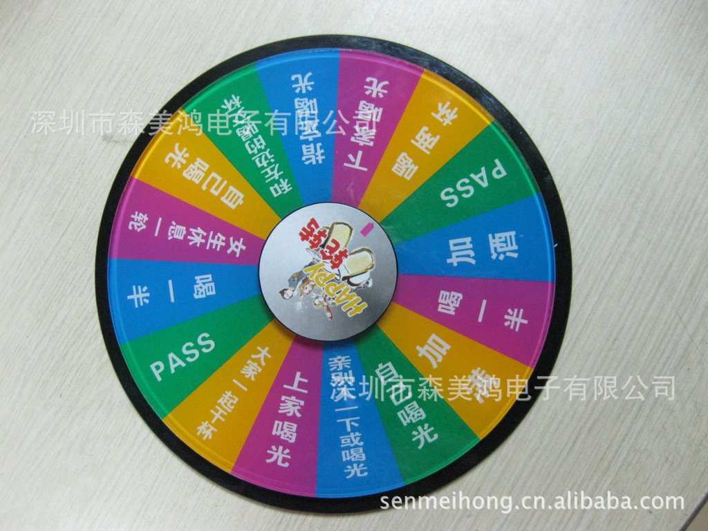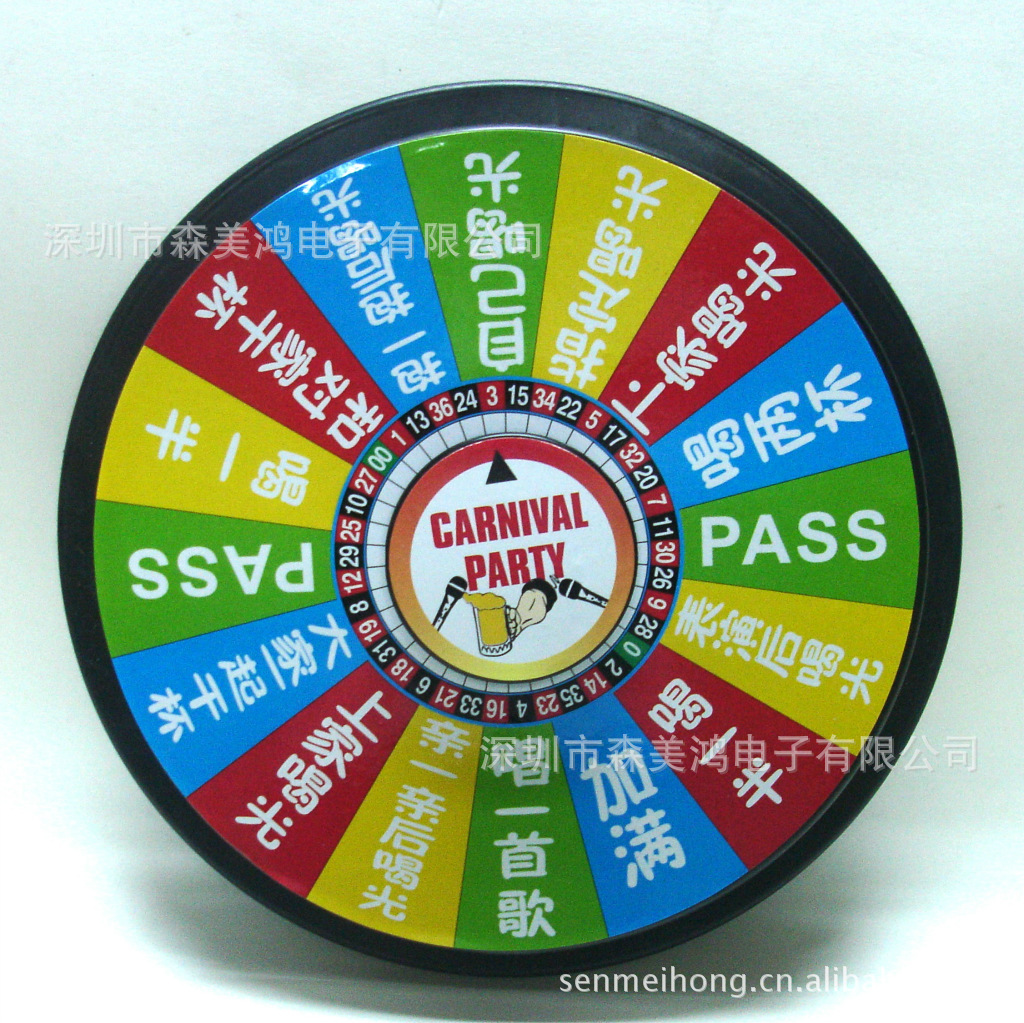 外圈為酒令內(nèi)容,分別有PASS*2項(xiàng)、和對家干一杯、自己喝光、抱一抱后喝光、指定喝光、下家喝光、喝一半*2項(xiàng)、加滿、唱一首歌、大家一起干杯、上家喝光、親一親后喝光、表演后喝光、喝兩杯(也可按你的要求訂做,歡迎來樣洽談)