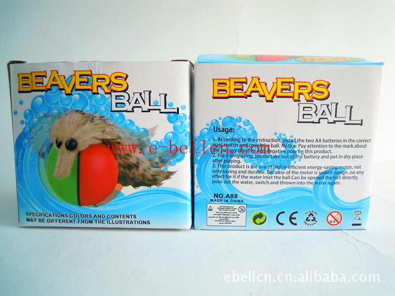 樣品編號(hào):EB-A88品名:電動(dòng)海貍球(水耗子)包裝:彩盒裝箱量:144 /2PCS樣品規(guī)格:28.0*8.0*7.0 cm外箱規(guī)格:69*36*68cm體積: 0.169cbm毛\凈重:22.8/19.8 KGS備注:適合水里玩;材料:ABS;顏色:藍(lán)紅/綠紅;球尺寸:8*8cm,海貍尺寸:21*6cm,彩盒尺寸:11*8*10cm
