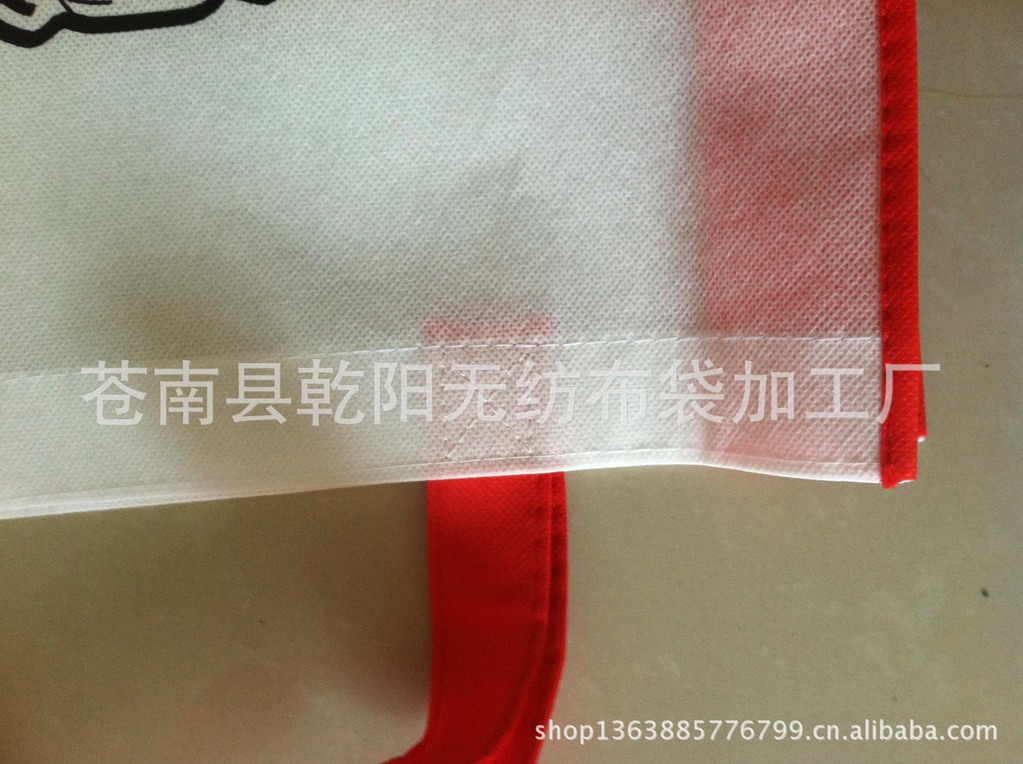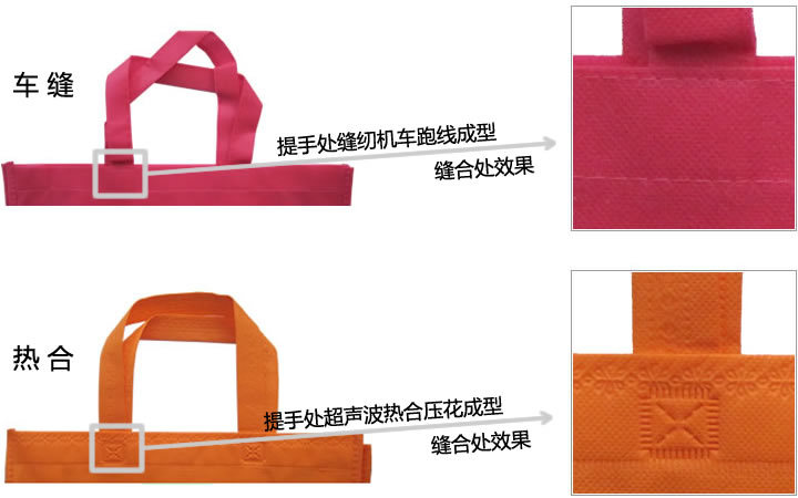 【熱合】以超聲波熱壓成型,承重約3KG左右。優(yōu)點是美觀,缺點是拎袋時手臂幅度過大,拎手處容易斷。