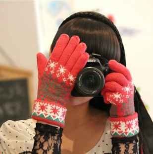 批發(fā)新款大雪花可愛保暖五指分指針織雙層毛線加厚手套女秋冬季