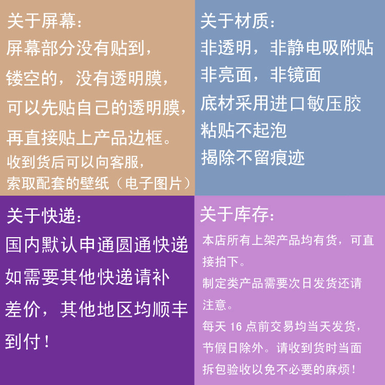 關(guān)于商品質(zhì)量:手機(jī)貼紙本身屬于消耗品,在貼到手機(jī)上時(shí)也有個(gè)別出現(xiàn)人為損壞,折痕,貼歪,撕下保護(hù)層而造成的圖案褪色等人為原因 上述原因不屬于商品質(zhì)量問(wèn)題買家自行承擔(dān)。彩貼貼合率在98%誤差為1-2MM左右 此范圍內(nèi)均視為無(wú)質(zhì)量問(wèn)題 如果貼合后差距超過(guò)此范圍請(qǐng)將貼好彩貼的手機(jī)拍攝(整體前后 問(wèn)題局部放大照片,有條件的客戶可以將尺子放在問(wèn)題部位測(cè)量誤差并拍下照片)發(fā)給我們會(huì)進(jìn)行處理 如果是質(zhì)量問(wèn)題 我們將承擔(dān)退換貨等費(fèi)用。如買家貼合后有上述問(wèn)題而直接將彩貼撕下,而使我們無(wú)法判斷是質(zhì)量問(wèn)題還是人為原因,賣家將不承擔(dān)任何費(fèi)用。