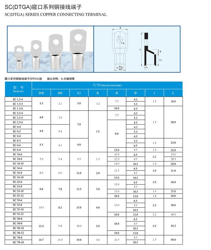 SC鍍錫窺口銅接線端子就是在原來SC窺口銅接線端子的基礎(chǔ)上,在表層鍍上一層"錫",增強(qiáng)SC窺口銅接線端子的導(dǎo)電能力,防氧化。 SC鍍錫窺口銅接線端子用于銅芯電纜與電氣設(shè)備的銅端連接 小起訂: 1000只
