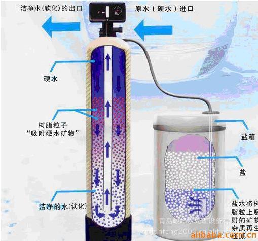 水的硬度主要有其中的陽離子:鈣(Ca)、鎂(Mg)離子構(gòu)成。當含有硬度的原水通過交換器的樹脂層時,水中的鈣、鎂離子被樹脂吸附,同時釋放出鈉離子。這樣從交換器內(nèi)流出的水就是去掉了硬度離子的軟化水,當吸附鈣、鎂離子的樹脂達到一定程度后,出水硬度增大,此時軟水器按照預(yù)定的程序自動進行失效樹脂的再生工作,利用較高濃度的氯化鈉溶液通過樹脂,使失效的樹脂重新恢復(fù)至鈉型樹脂。