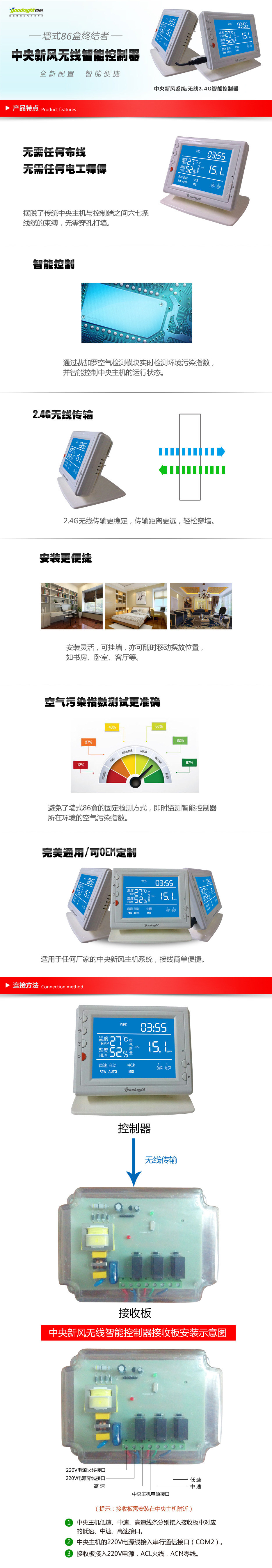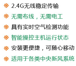 告別布線困難,操作繁雜的傳統(tǒng)墻式86盒,2.4G無線傳輸更快更穩(wěn)定,無需布線無需電工師傅??刂破骺呻S心擺放,配備實時空氣質(zhì)量檢測模塊,可智能調(diào)節(jié)中央主機運行狀態(tài),開創(chuàng)中央新風系統(tǒng)先河。