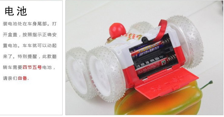 在車(chē)子后尾部裝入四節(jié)五號(hào)電池,打開(kāi)開(kāi)關(guān),勁爆的音樂(lè)就會(huì)響起來(lái),四個(gè)透明車(chē)輪會(huì)交替發(fā)出紅藍(lán)閃爍的光芒,特制的帶釘車(chē)輪,使其摩擦力增大,遇到障礙車(chē)身會(huì)自動(dòng)垂直翻身,車(chē)子上的人頭在翻過(guò)去后就變?yōu)榱硪环N顏色的人頭、反面的車(chē)身也是另一中顏色、本車(chē)很牢固哦!既是一款不錯(cuò)的特技車(chē),又是一款白輪雙面車(chē)哦。