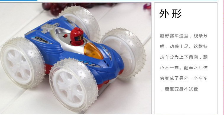 新品上市,遇上障礙,會(huì)翻個(gè)跟頭繼續(xù)向前,車(chē)子兩面都很漂亮的。打開(kāi)開(kāi)關(guān),音樂(lè)響起,車(chē)輪燈光跟著閃爍,漂亮哈!