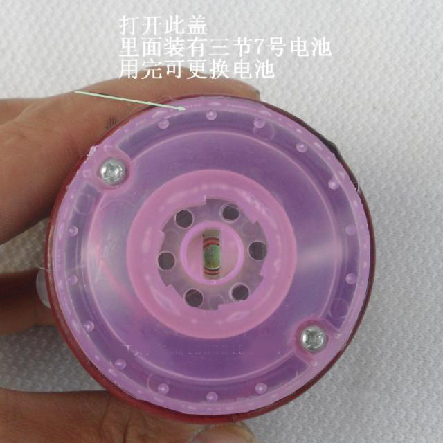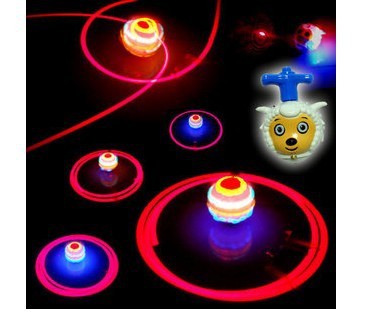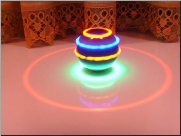 2、用發(fā)條在陀螺上旋轉(zhuǎn)一圈至一圈半(每個陀螺可能不一樣,自行摸索),然后貼近地面,按下發(fā)射器并抬開(動作間的搭配需自行把握好,文字描述不出來),陀螺會在地上歡快的旋轉(zhuǎn)并且發(fā)出音樂,陀螺身上的彩燈會不停的變換,在在陀螺的周圍還有一道紅紅的激光線,特別漂亮,聲音也很好聽。