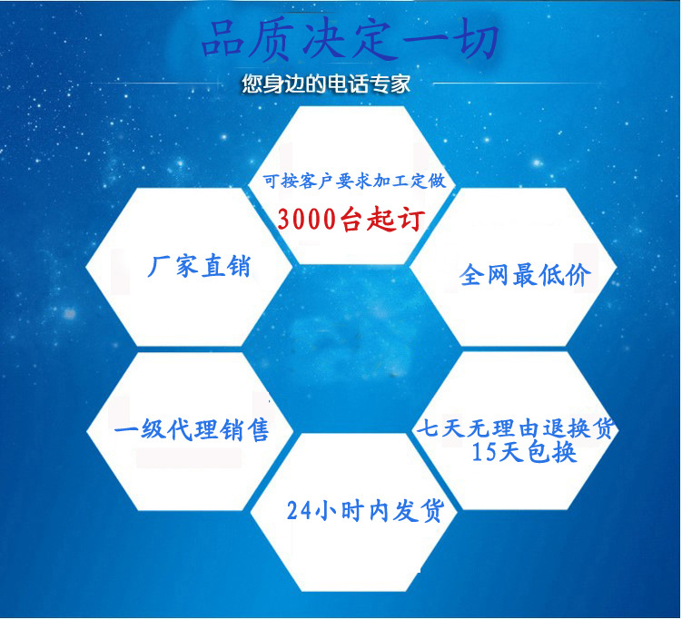 我司是專業(yè)研發(fā)、生產(chǎn)和銷售有繩電話機的直銷廠家,現(xiàn)為了惠及廣大的普通消費者和擴大我司的口碑,現(xiàn)對我司的幾款新品進行底價大促銷,支持網(wǎng)購和定做。公司研發(fā)人員有20多年的研發(fā)經(jīng)驗,公司員工有300多人月產(chǎn)量25萬臺,有噴油部,塑膠部、絲印部、開發(fā)部,我公司有8年的OEM生產(chǎn)定做經(jīng)驗,款式將近500多種定做各種類型的電話機。