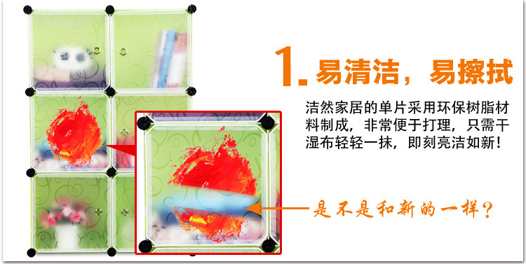 1.該款產(chǎn)品采用的是輕便環(huán)保的PP材料,防潮,耐污,拆卸自由,組裝簡單,清潔便利(溫水抹布一擦即可,如果是頑固污漬可以適當使用一些如洗潔精類的清潔劑擦拭)。