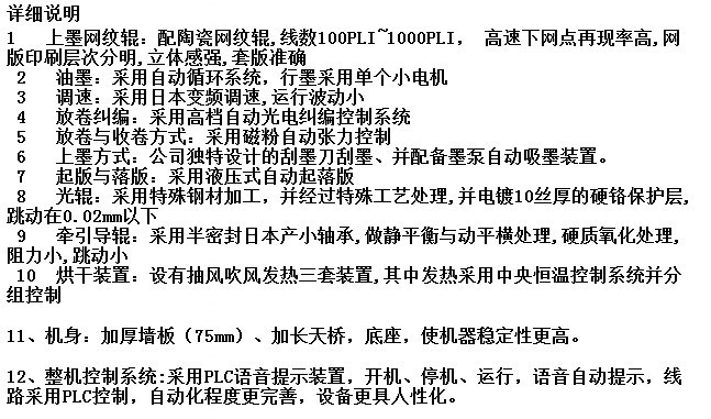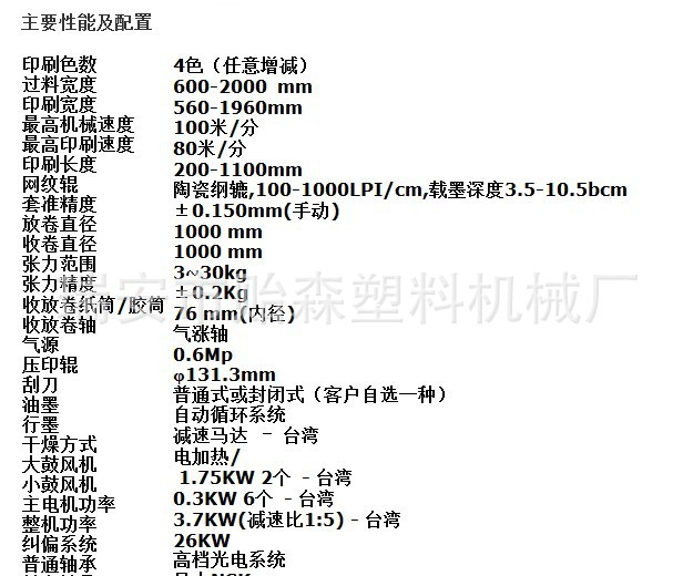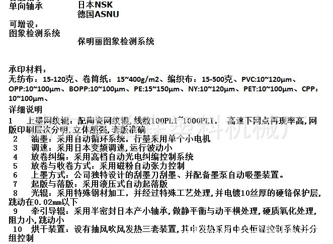 用途: 該機(jī)適合印刷聚乙烯、聚丙烯塑料袋、玻璃紙、卷筒紙,無(wú)紡布等包裝材料,是食品包裝,超市手提袋、馬夾袋、服裝袋,無(wú)紡布袋等包裝的理想印刷設(shè)備。 性能和特點(diǎn): 1、操作簡(jiǎn)便,起動(dòng)柔和,套色準(zhǔn)確。 2、計(jì)米器可根據(jù)要求設(shè)定印刷數(shù)量,到數(shù)自動(dòng)停機(jī),斷料自動(dòng)停機(jī)。 3、手動(dòng)起落印版滾筒,升降后油墨自動(dòng)攪拌。 4、網(wǎng)紋滾筒傳墨,墨色均勻。 5、可靠的干燥系統(tǒng),配合高速運(yùn)轉(zhuǎn),停機(jī)自動(dòng)斷路。 6、360度連續(xù)可調(diào)的縱向?qū)ㄑb置。 7、進(jìn)口變頻電機(jī)調(diào)速,適應(yīng)不同印刷速度。 8、版輥?zhàn)霞笆樟霞苌暇b有點(diǎn)動(dòng)及停止按鈕,便于裝版時(shí)操縱機(jī)器