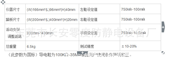 雙腳人體綜合測試儀是為測量人體綜合電阻(包括人體、手腕帶和鞋等的電阻)而設(shè)計的裝置。本儀器能對人體綜合電阻大于109Ω和小于105Ω時,進行檢測與報警,雙腳人體綜合測試儀配制了750KΩ-10MΩ電路(用于測試手腕帶)和750KΩ-100MΩ電路(用于測試鞋),此儀器是測試手腕帶和鞋套的理想選擇。