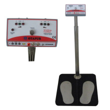 2.ESD測試時,只要雙腳分別踏在相對的金屬踏板上,戴好手腕帶挾入或插入手腕接線口上,手指輕輕接在金屬測試按鈕就一目了然地知道ESD裝備是否合格。注:請勿戴手套或用指甲按在金屬測試按鈕。正確使用見圖3。