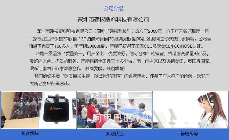 ★本公司鄭重承諾:在本公司購買的任何一款3D眼鏡,經(jīng)過公司工程師格測(cè)試,鏡片透光性好,框架耐磨舒適,鏡框與鏡片都采用***標(biāo)準(zhǔn)的環(huán)保材料,不會(huì)對(duì)人的皮膚和眼睛產(chǎn)生任何傷害,請(qǐng)放心用!