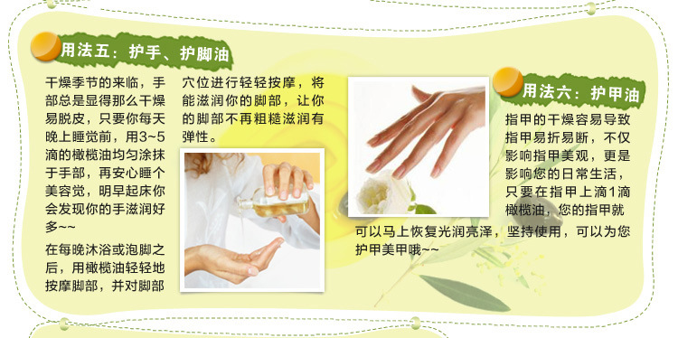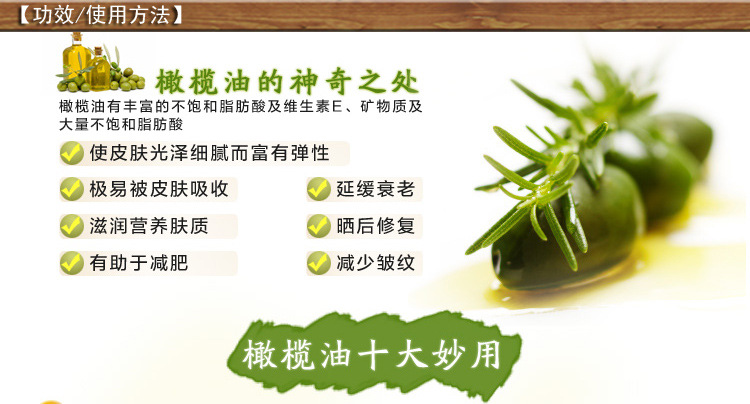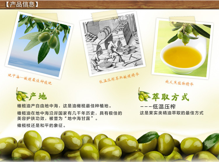 【產(chǎn)品功效】:橄欖油是從橄欖中榨取出來(lái)的一種蛋黃色透明液體,