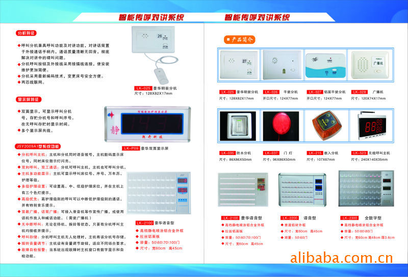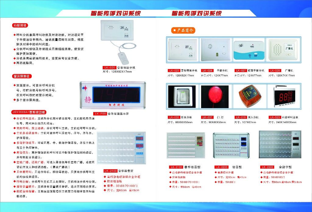 我廠生產(chǎn)的LK系列智能醫(yī)用傳呼系統(tǒng)是我廠傾心研究并全新推出的新一代智能護(hù)理通訊產(chǎn)品。它的技術(shù)更***、功能更強(qiáng)大。系統(tǒng)采用兩總線無極性連網(wǎng)方式使安裝與維護(hù)更加簡單便捷。主機(jī)外殼超薄型設(shè)計,造型精巧,可壁掛、桌面任意放置。多種款式的分機(jī)采用流線設(shè)計,新穎美觀,能在各種場合安裝使用,滿足不同客戶的需求。
