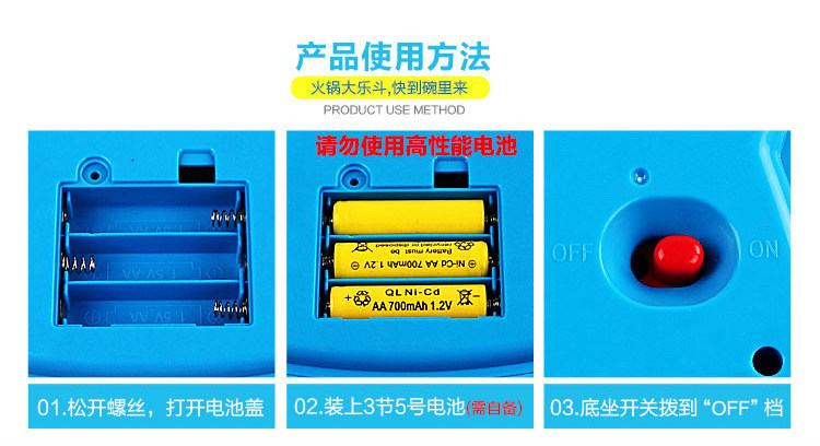 按鍵的說明,店主親試,裝上電池以后,在底下有個開關,打到NO模式,反過來,放上***的鍋,液晶屏上會有數(shù)字10,就是代表十秒,可按右邊紅色的二個按鍵,增加時間還是減少時間,長是五分鐘,然后按下左邊粒***的按鍵,鍋中間***小風車就會轉起來,里面放上仿真食品,,就可以轉動起來,,很像我們平時真的吃火鍋時的樣子,