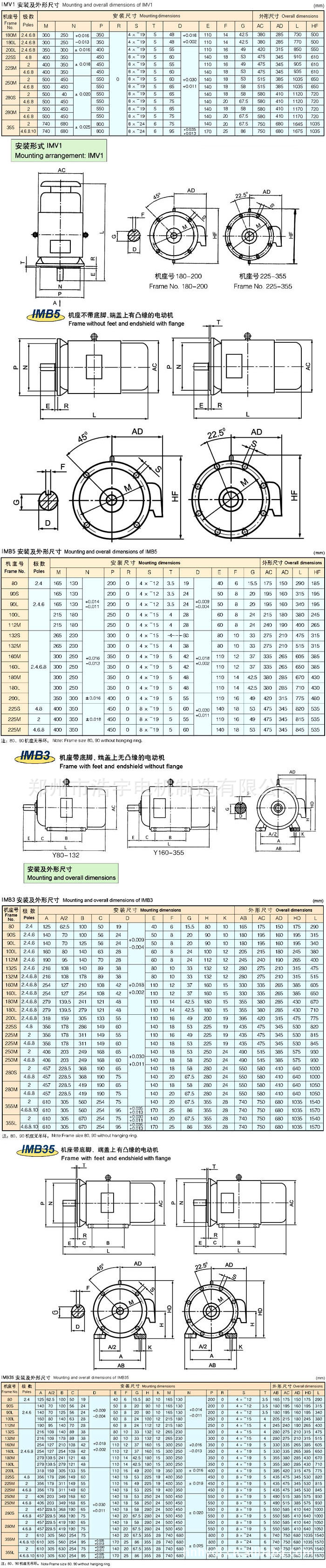 Y系列電機中心高80-355mm。絕緣等級為B級,外殼防護等級IP44,冷卻方式IC411。基本安裝方式有IMB3、IMB5、IMB35、V1、V3等。工作方式:S1連續(xù)工作制,環(huán)境溫度-15— +40℃,海拔1000米以下。電壓380V,頻率50HZ。接法:3KW及以下為Y接,4KW及以上為△接。