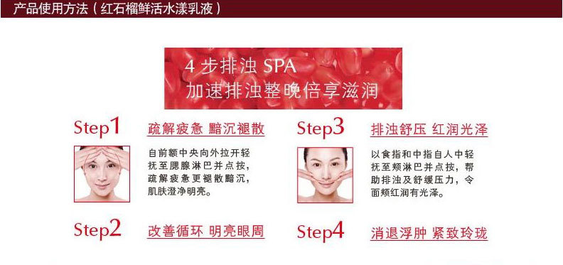 【Odinx】歐迪娜紅石榴鮮活***保濕乳液使用方法:早晚潔面并使用化妝水后,取適量(按壓1-2次)輕抹于面部及頸部,輕輕按[mo]至吸收即可,注意避開眼周。
