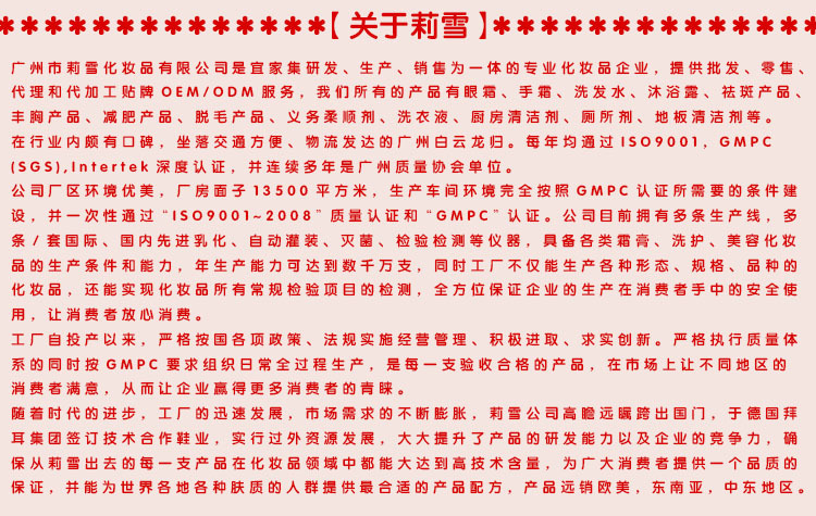 3、莉雪紅石榴***保濕乳液擁有配套齊全的產(chǎn)業(yè)鏈,***的生產(chǎn)車間,強(qiáng)大的研發(fā)團(tuán)隊(duì),為您量身定做。歡迎各位有意者來廠參觀,免費(fèi)打樣,洽談合作!
