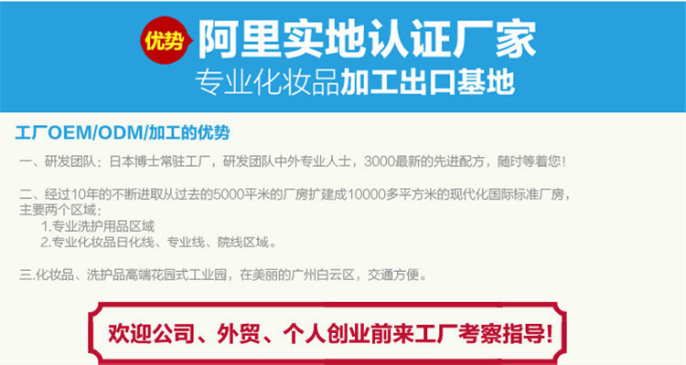 是一家集科研、生產(chǎn)、銷售為一體的大型化妝品企業(yè),廠區(qū)環(huán)境優(yōu)雅,廠房面積5000平方米,并按照***標準建立高等級凈化車間及設備***的科研實驗中心,