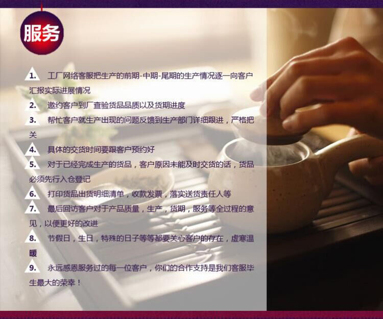 A:半成品客戶預(yù)付50%定金,產(chǎn)品加工完成后付清尾款發(fā)貨;成品出貨預(yù)付50%定金,生產(chǎn)完成后付清尾款發(fā)貨;所有支付寶客戶,金額在5000元以下,可支付寶***,金額大于5000元,預(yù)付款50%必須直接到賬,余款可支付寶***......