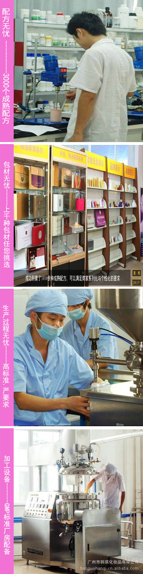 廣州市韓琪化妝品有限公司是***化妝品OEM、ODM、OBM加工企業(yè),始終秉承***功效配方及精良的制作工藝,致力于為眾品牌商、美容連鎖機(jī)構(gòu)、美容儀器開發(fā)商提供***、新穎、***、***的綠色環(huán)保系列產(chǎn)品。涉及護(hù)膚、養(yǎng)膚、養(yǎng)生、美容、保[jian]等領(lǐng)域。