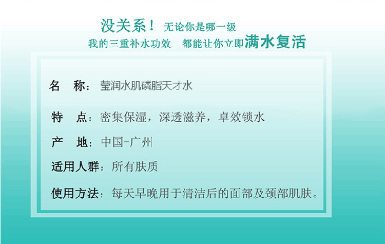 年輕肌膚需要更***的護(hù)膚,層層疊加才能做足的保濕功課,現(xiàn)在,讓這一步放大。將3重保濕功效,凝于天才每一滴:化妝水般的補(bǔ)水力、精華般的滋養(yǎng)力、乳液般的鎖水力,以“水油平衡”的絕妙比例,注入這一瓶清潤(rùn)保濕天才水,***保濕的步,放大后續(xù)護(hù)膚每一步。不同分子大小的營(yíng)養(yǎng)精華及補(bǔ)水成份分別針對(duì)不同肌膚層面發(fā)揮作用,底層補(bǔ)水,里層滋養(yǎng),表層鎖水,帶來(lái)長(zhǎng)效的補(bǔ)水保濕。