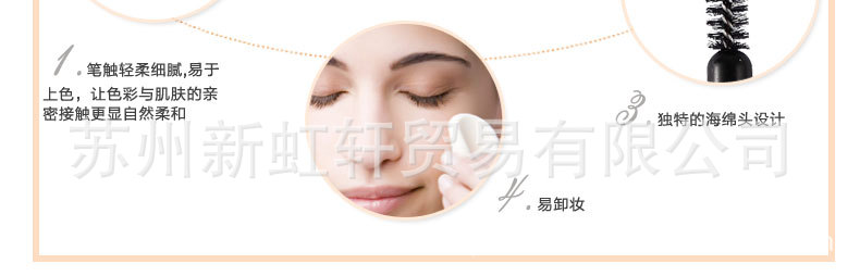 1、筆觸輕柔細(xì)膩,易于上色,讓色彩與肌膚的親密接觸更顯自然柔和。