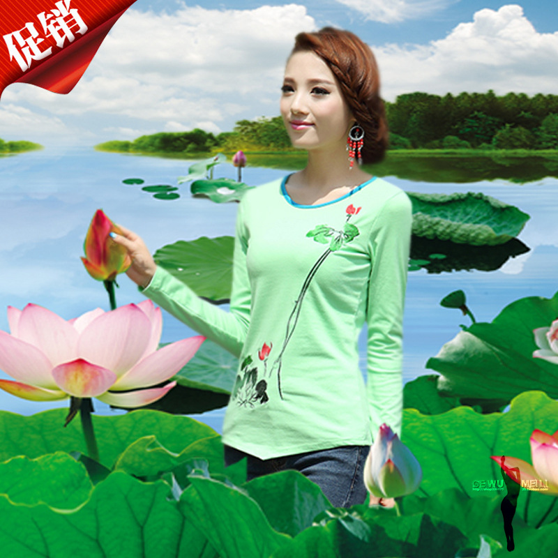 廠家直銷新款品質(zhì)民族風(fēng)長袖T恤彈力純棉繡花女式打底衫特價(jià) 促銷